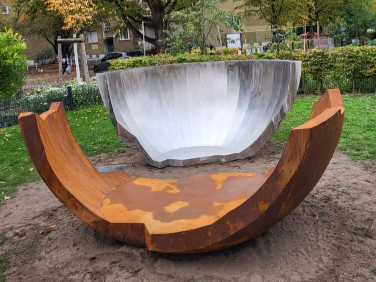 Das Werk besteht aus zwei großen, nicht zusammenpassenden Schalenfragmenten – eines aus glänzendem Edelstahl, das andere aus rostigem Cortenstahl. Jeder wird hier etwas anderes erkennen können. Mich erinnern die gebrochenen Kanten an sich plötzlich verändernde Lebensverhältnisse, an Einschnitte, an eine gebrochene Lebensbiografie.